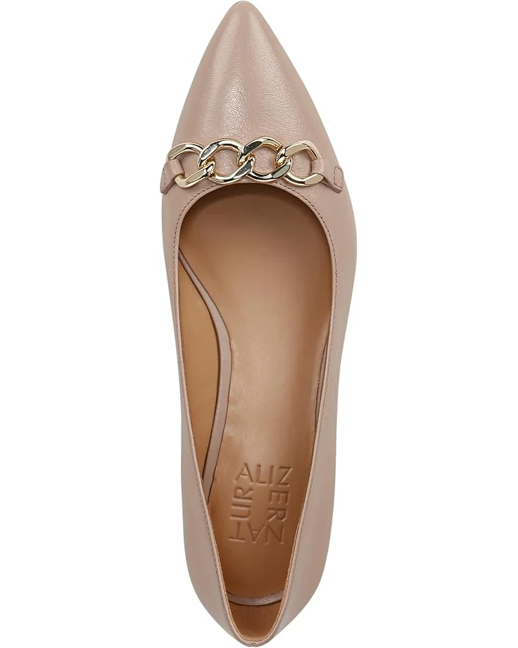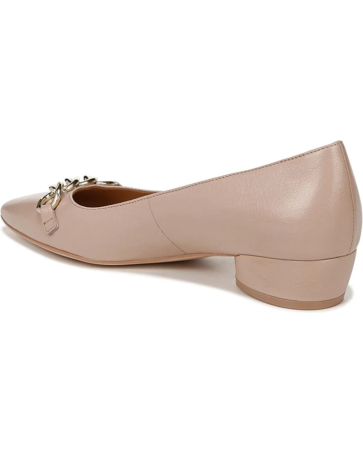 - Look perfect wearing the classy Naturalizer® Becca. Crafted from leather upper, this pair of slip-on sandals features low block heel, closed pointed toe, chain link detailing on the vamp, and brand detailing on the footbed.