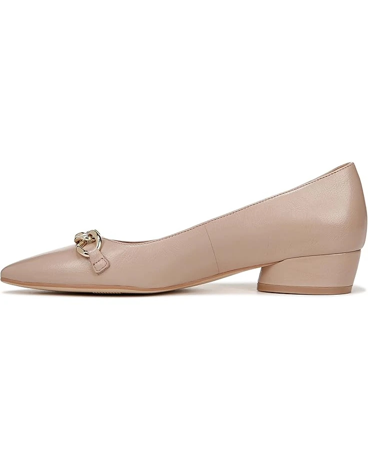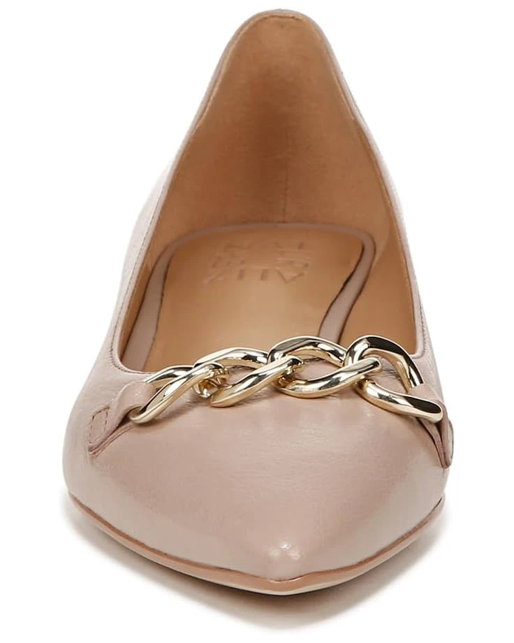 - Look perfect wearing the classy Naturalizer® Becca. Crafted from leather upper, this pair of slip-on sandals features low block heel, closed pointed toe, chain link detailing on the vamp, and brand detailing on the footbed.