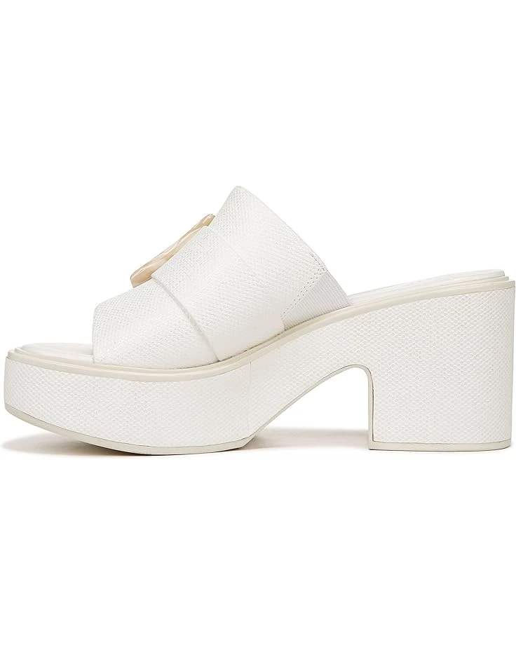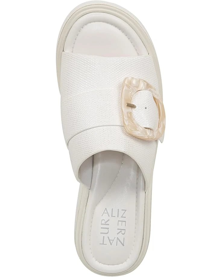 - Wide one-band upper is highlighted with an oversized buckle.