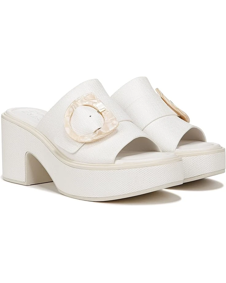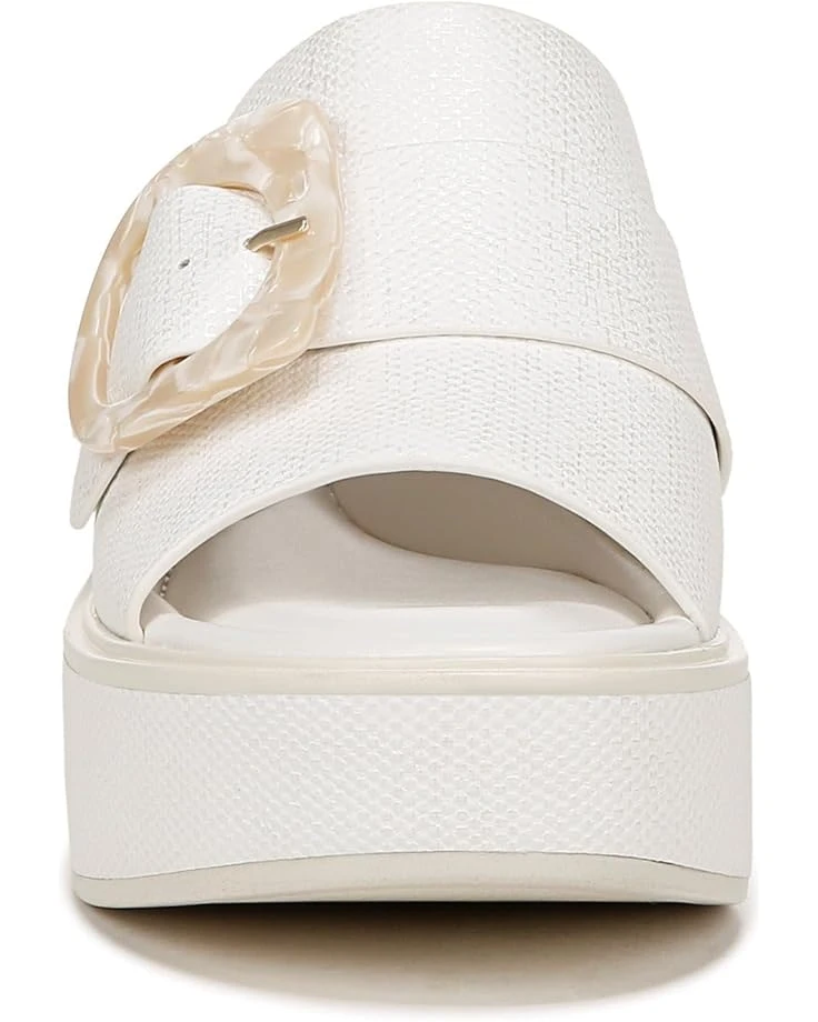 - Wide one-band upper is highlighted with an oversized buckle.