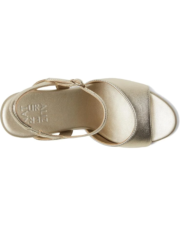 - Complete your party look in the Naturalizer® Lala heels that elevate everything. Crafted from metallic leather upper, PU lining, and foam insole, this pair of sandals features round open toe, adjustable buckle closure, new contoured footbed with extra layer of padding, contoured shape, pressure distribution, less fatigue and longer wear for a next-level fit. Contour+ Comfort technology for a premium fit and all-day comfort experience, and stiletto heel.