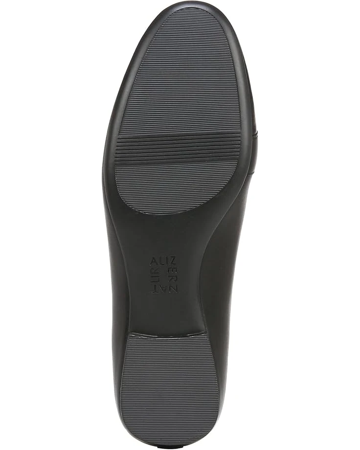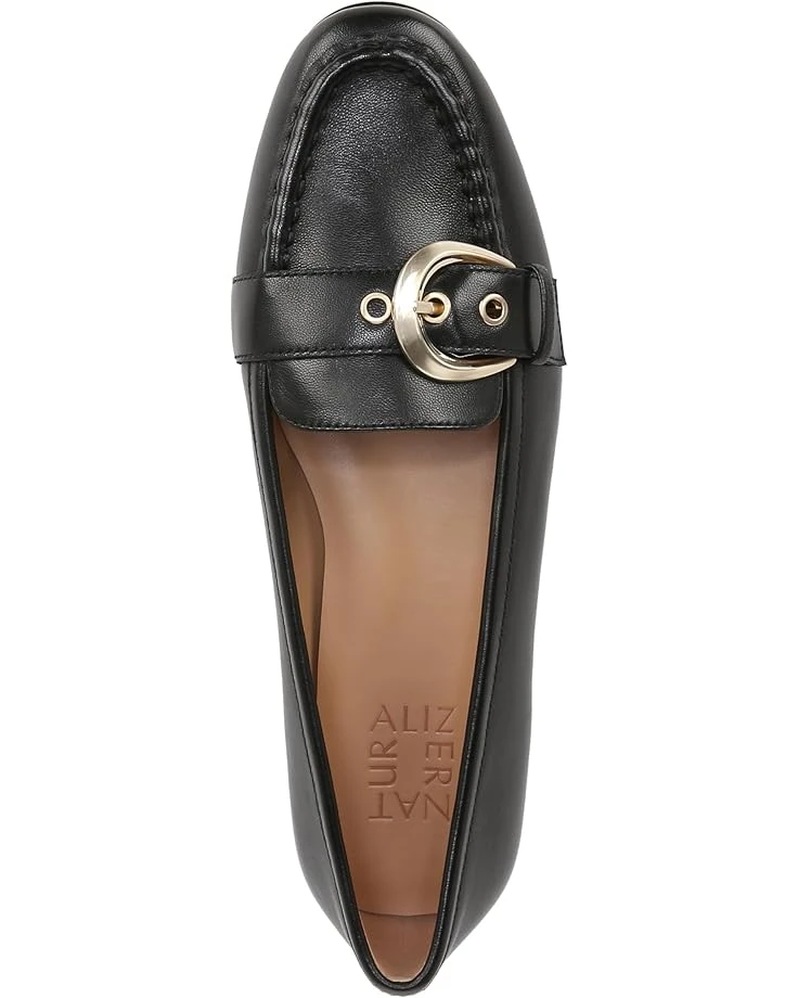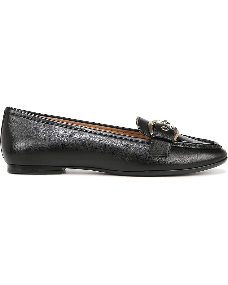 - Boost your charm and comfort wearing the Naturalizer® Lola. Crafted from leather upper, this pair of slip-on shoes features synthetic lining, contoured footbed with arch support, closed round toe, and stitched details and decorative buckle detailing on the vamp.