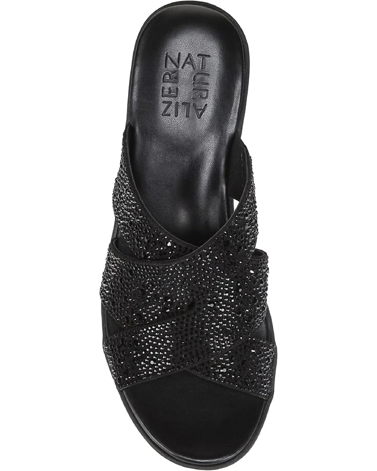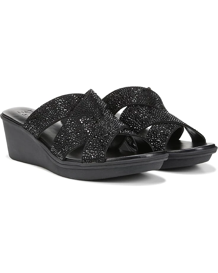 - Slay your casual style game effortlessly wearing Naturalizer® Rowena 2 Sandals, crafted in an open toe design with wedge heel. The sandals feature a strappy sparkly synthetic upper, synthetic lining, foam insole, and Contour+ Comfort technology for a premium fit & all-day comfort experience.