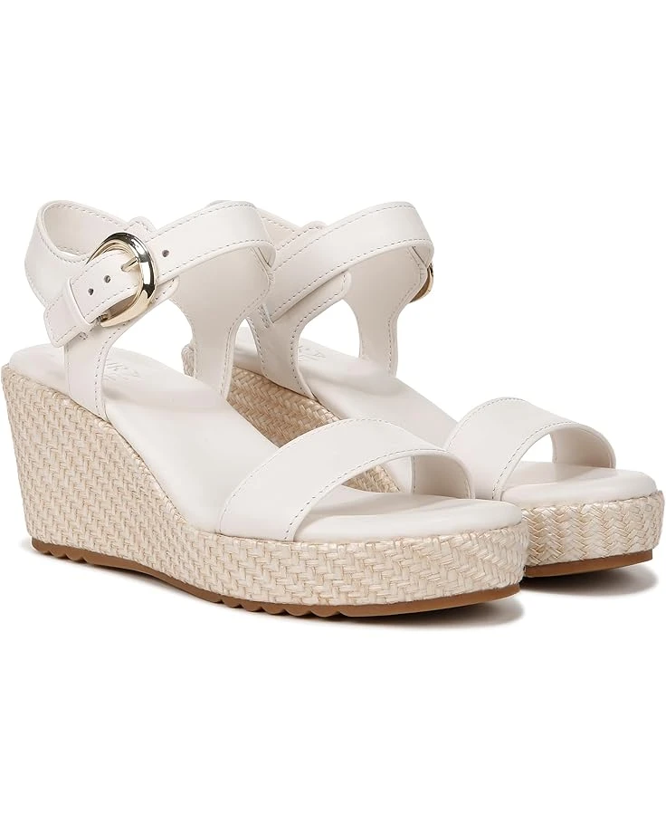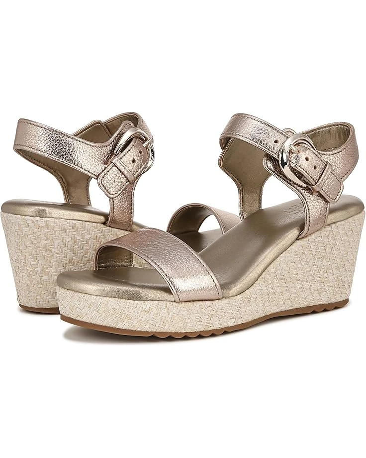 Beautifully made leather wedge sandal. The perfect height. Simple gold buckle detail adds a nice polished touch. Very comfortable right from the first time I wore them.