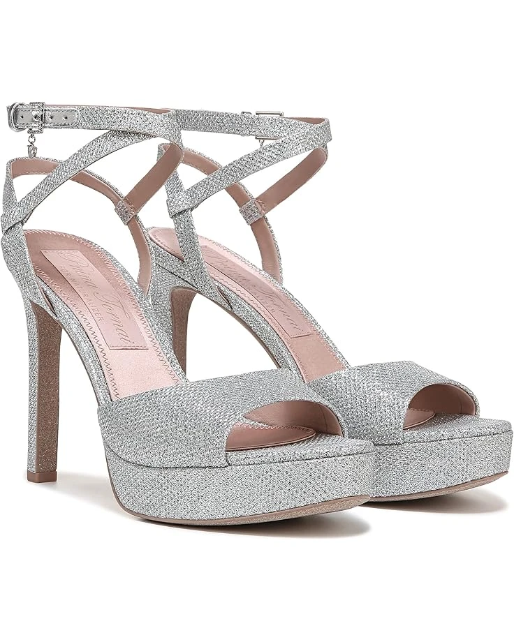 I have been searching for a white satin, peep toe, platform for my wedding. These pictures do not do the shoes justice. The gold bottom glistens and the charm hanging from the buckle is actually a rhinestone, not what looks like a silver heart in the photo. The base is narrow. The packaging is so nice; a black sturdy box with dusters include. For dancing all night, I will still need to add an insole to the base. You are obviously paying more for the Pnina Tornai name but she is dead on with this timeless look that should always be available for brides!