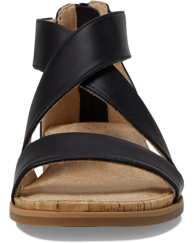 I bought four similar-looking black strappy sandals (the Dr. Scholl’s Golden Hour, the Naturalizer SOUL Cindi, the LifeStride Zoom, and the SOREL Ella III Sandal), all in my regular size 8.5, and felt the Naturalizer SOUL Cindi was the best fit for me. They are by far the most comfortable of the four, have a slight heel, and can be dressed up or down. The Dr. Scholl’s Golden Hour was my second choice but was physically heavier and looked heavier due to the black sole. I felt the LifeStride Zoom was rigid and uncomfortable, and the SOREL Ella III was fine but I preferred the Naturalizer Cindi over it (and for $25 less).